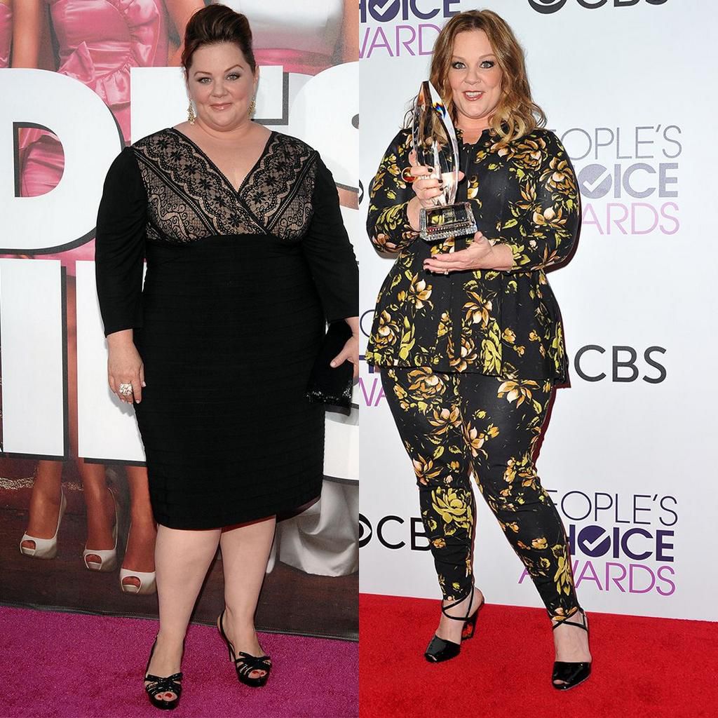 Melissa McCarthy Back in 2011, Melissa McCarthy told People her body was a "work in progress," but since then, shes lost a reported 75 pounds. Shes now a size 14, and attributes her weight loss to her laid-back lifestyle. "No trick, nothing to tell, just super boring life. You bring it real down, you dont do anything fun and you go to bed at 7:30 that's the trick," she told Extra . Getty Images