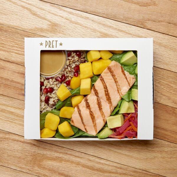 Pret A Manger Salmon And Mango Grain Salad This grain salad gets rave reviews from Auslander Moreno. Increased consumption of raw vegetables is always welcome, she says. The combination of probiotics-packed pickled cabbage, as well as prebiotics-containing chickpeas, is also great, she adds. And not only is salmon super high in protein, but it also contains vitamin D and omega-3 fatty acids, which both support brain health. Per serving: 470 calories, 23 g fat (3 g saturated), 48 g carbs, 14 g sugar, 650 mg sodium, 7 g fiber, 23 g protein Courtesy Image