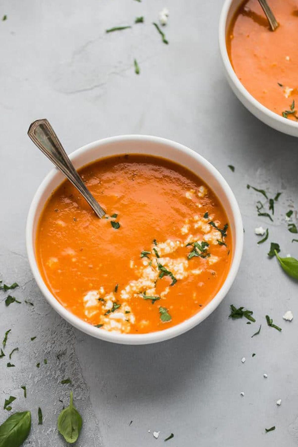 Easy Tomato Feta Soup The cream of tomato soup you love with a twist of feta cheese. Yes, please. Get the recipe from Cooking LSL . Per serving: 170 calories, 13 g fat (8 g saturated), 10 g carbs, 6 g sugar, 464 mg sodium, 2 g fiber, 4 g protein. Cooking LSL