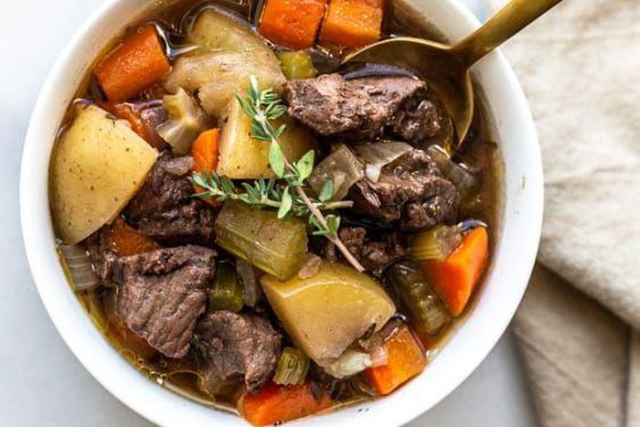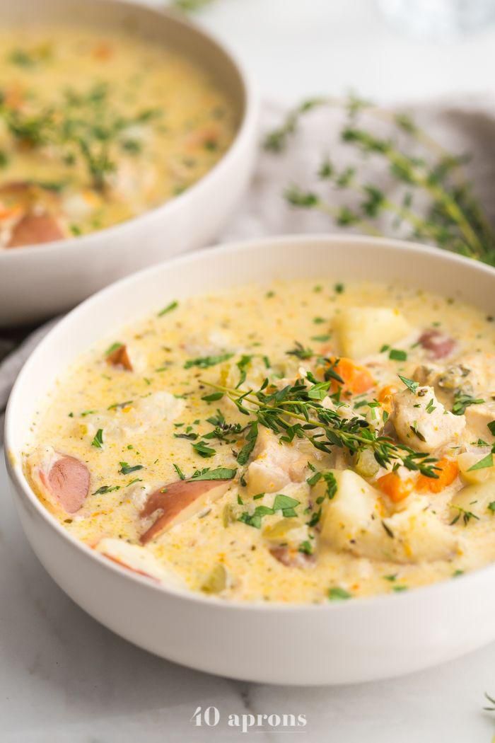 Healthy Chicken Pot Pie Soup Paleo and Whole30 approved, this soup from 40 Aprons is comforting, rich, and creamyand actually good for you. It has healthy fats from coconut and cashews, and ample protein to fill you up for hours. Plus, its done in just 25 minutes! 40 Aprons