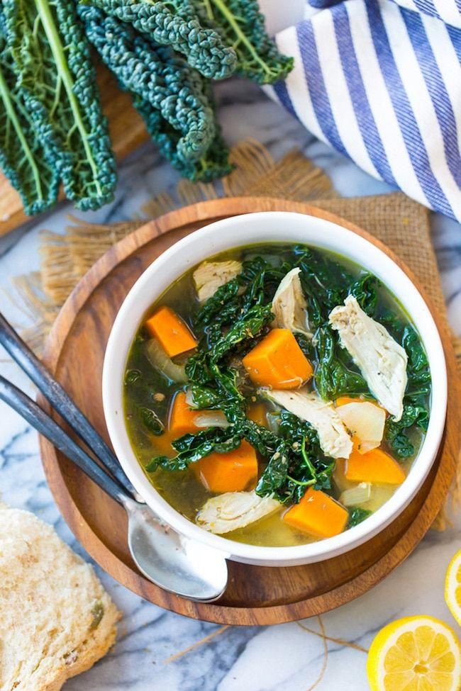 Sweet Potato, Kale and Chicken Instant Pot Soup This light recipe from A Saucy Kitchen has a nice broth to boost your immune system and help fill you up without making the meal too heavy. Add more veggies for an even heartier dish! A Saucy Kitchrn