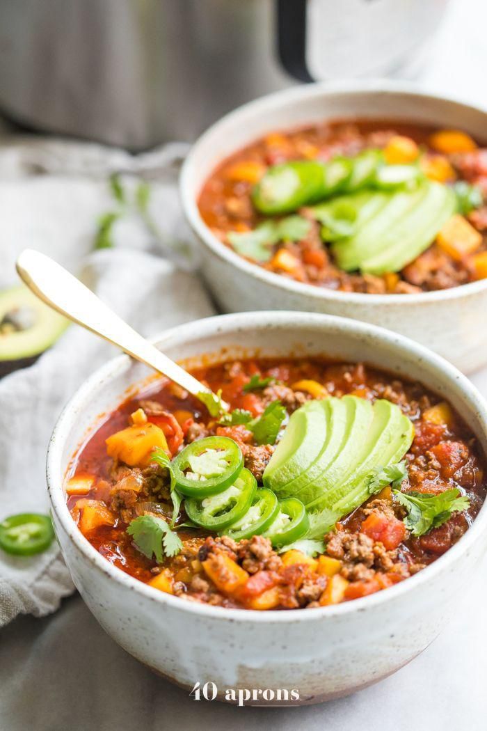 Instant Pot Whole30 Chili with Butternut Squash Fall and winter time call for warm chili recipes that stick to your bones. This instant pot dish from 40 Aprons has antioxidant-rich squash and protein-dense pork and beef to fill you up during the colder weather. Top with avocado slices for extra satiating fat and creaminess! 40 Aprons
