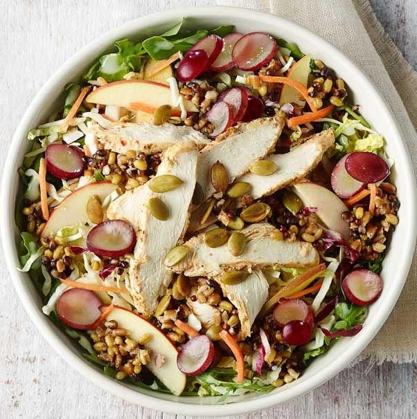Panera: Ancient Grain And Arugula Salad With Chicken Ivey loves this option from Panera since it provides four food groups in a single salad: vegetables, fruits, lean protein, and grains. Not too shabby. Per serving: 210 calories, 7 g fat (1.5 g saturated), 20 g carbs, 10 g sugar, 150 mg sodium, 3 g fiber, 12 g protein Panera
