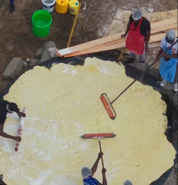 They prepared a mixture of water, salt, sugar, oil, and turmeric, then mixed it with 153 kilograms of flour to create two large batches of dough.