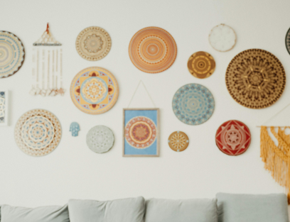 Even framed photographs, postcards, or handcrafted wall plates arranged in a gallery style can make a plain wall feel more dynamic and inviting.