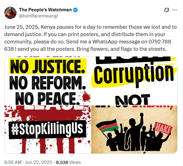 “June 25, 2025, Kenya pauses for a day to remember those we lost and to demand justice. If you can print posters, and distribute them in your community, please do so…Bring flowers, and flags to the streets.