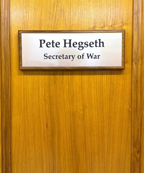 Secretary Pete Hegseth’s nameplate was also swiftly changed to Secretary of War to reflect the rebrand.