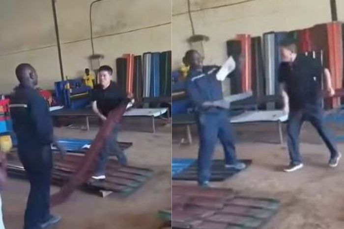 The confrontation was caught on camera as the Chinese national picked up an iron sheet from a pile that lay on the floor and used it to assault the helpless worker who raised his hands as if t plead for mercy without retaliating.