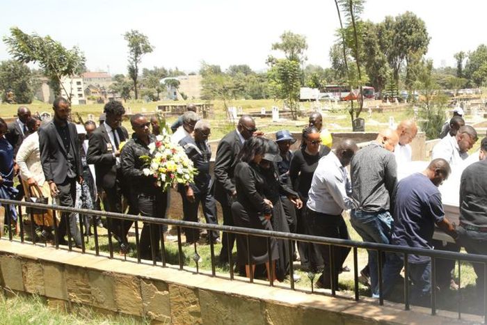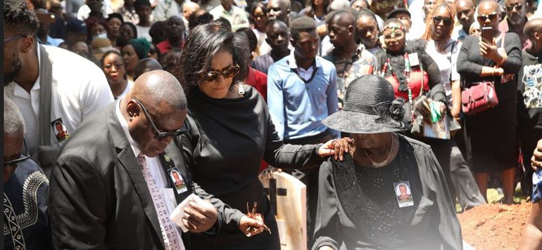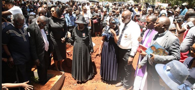 His widow, Alice Mwikali donned a black attire and was seen watching in pain as the body was lowered to the grave.