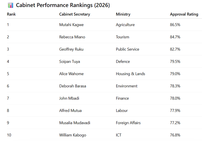 Foreign Affairs CS Musalia Mudavadi (77.2%) and ICT CS William Kabogo (76.8%) complete the top 10.