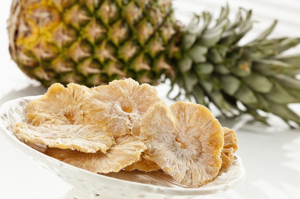 Dried Pineapple If you're itching for a little tropical twist, sweet nibs of dried pineapple go a long way, says Haas. Per quarter-cup serving: 92 calories, 0.1 g fat (0 g saturated), 23.8 g carbs, 20.7 g sugar, 1.2 mg sodium, 1.3 g fiber, 0.5 g protein Westend61 - Getty Images
