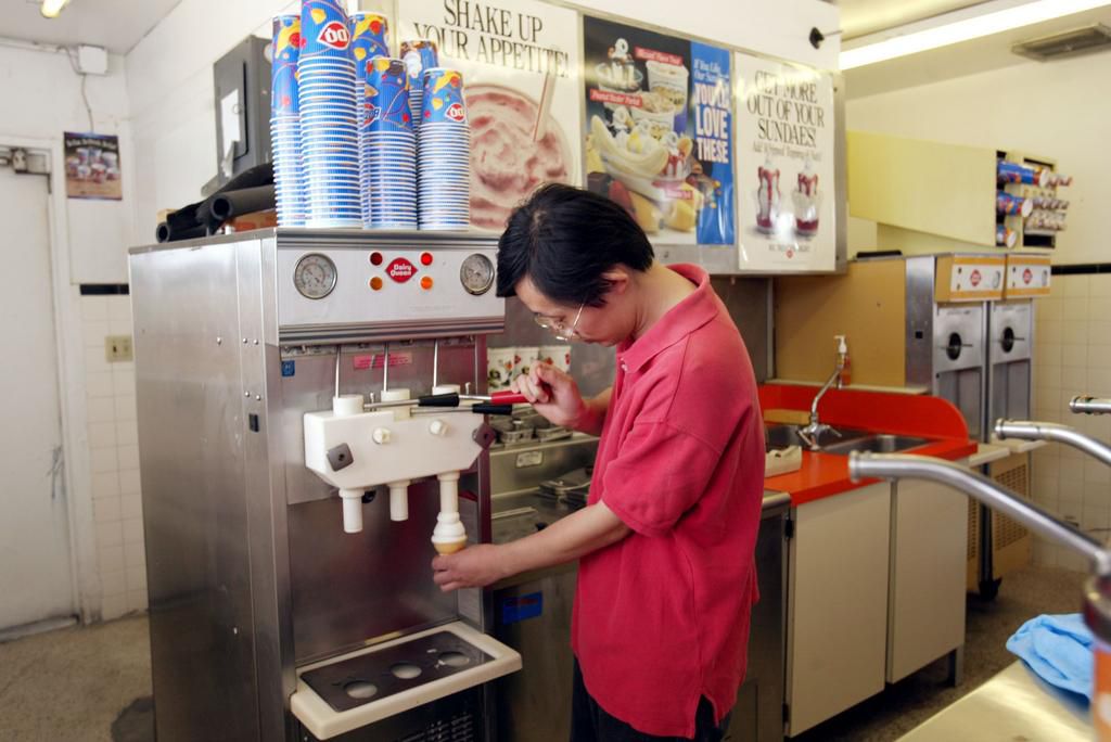 Royal Reese's Blizzard Filled with Peanut Butter at Dairy Queen As far as Dairy Queen treats go, Blizzards come with a whole lot of calories and sugar . And this Blizzard has 1,500 calories and 149 grams of sugar in the large. Healthier option: "If you just can't resist a Blizzard, go for a mini," suggests Levinson. This particular mini carries 530 calories and 48 grams of sugar. "The best bet," she adds, "is to go for a classic kids' or small cone with one topping." Before toppings, both chocolate and vanilla kids' cones have 170 calories and 18 grams of sugar. Joe Raedle - Getty Images